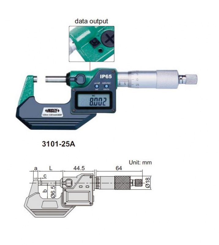 Teclas de funções: liga/desliga, valor de referência, mm/polegada, ABS/INC (medição absoluta e incremental) e saída de dados