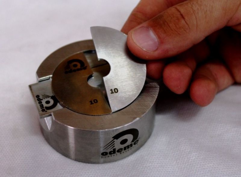 Acompanha um conjunto com sete lâminas bipartidas com diâmetros de 4 a 10 mm por 1 ou 2 mm de espessura.