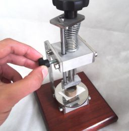 Desenvolvido para auxiliar na confecção de espécimes para o teste de cisalhamento em braquetes. Possui sistema para fixação do fio ortodôntico com deslocamento vertical, travamento e retorno por mola.
